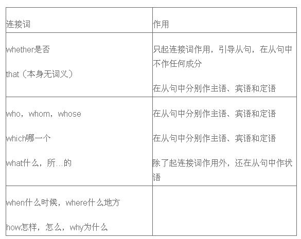 疑问词(who, whom, whose, what, which, where, why, when, how)可以引导主语、宾语和表语从句。