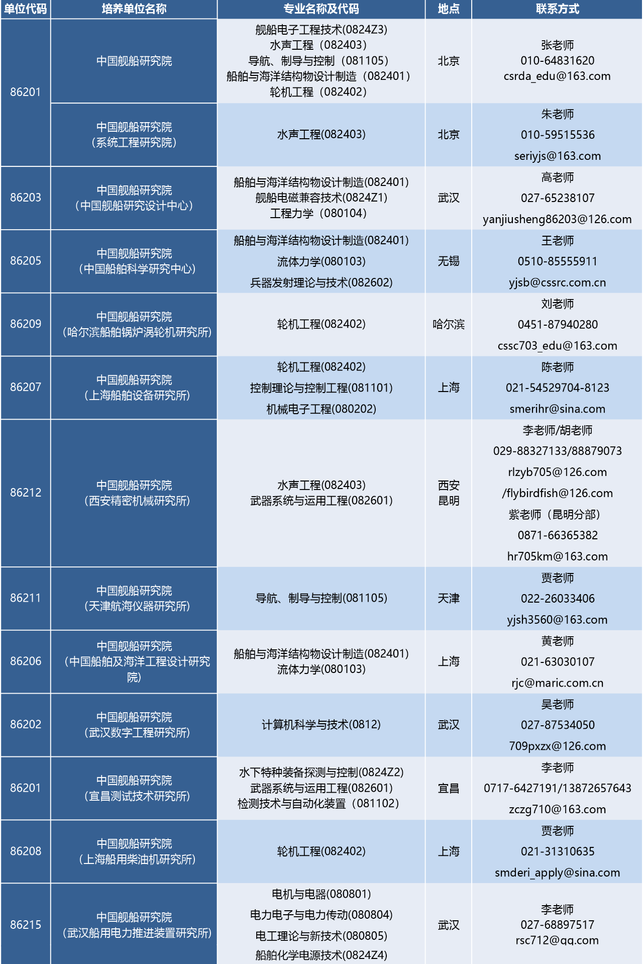招生信息以各招生单位研招网招生信息为准,各培养单位招生目录及联系方式详见下表。