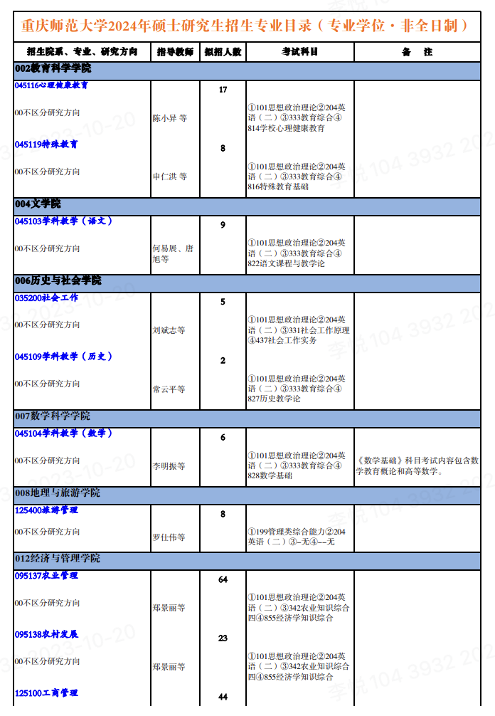 2024年重庆师范大学非全日制硕士招生专业目录已发布,详细介绍了重庆师范大学研究生非全日制专业代码及专业名称、拟招生人数、考试科目、专业备注等,帮助备考2024考季的同学快速查找重庆师范大学研究生招生相关信息。