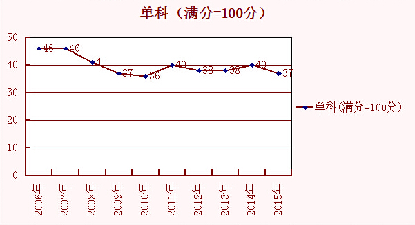 其中,单科(满分=100分),近十年的走势也和总分大致一致,经过2006至2010年的直线下降之后,近几年都趋于平稳,分数在38分上下波动,相信2016年哲学国家线也会遵循这一规律。