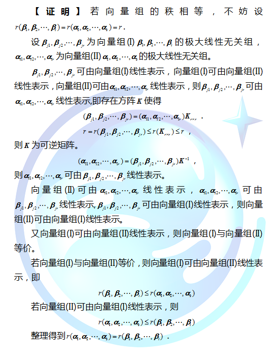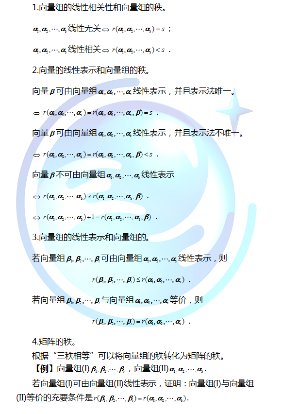 向量组的秩是考试的重点,也是考试的难点。向量组的秩可以将向量组的线性相关性、线性表示联系起来,本文在这里将其进行归纳总结,便于考生解答题目。
