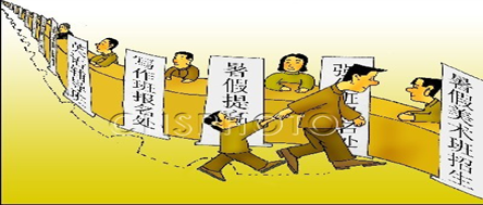 The drawing reminds us of a common social phenomenon that parents are too eager to make their children distinguished and guarantee a brilliant future for them. But many of them neglect children's willingness. We often come across many parents who ask their children to attend all kinds of training classes as the above picture shows, but is it important to make a good student and later a successful person? What is really important, in my opinion, should be something else. That is the environment created by the parents and felt by the child. How can a child grow up into a scientist who loves research when the noise of playing mahjong(麻将) is always there? Actions always speak louder than words. If parents turn off TV and family cinema, stop all noisy games and get down to reading quietly, the positive impact on the child will be considerable. In the years to come, the child will gradually learn how to concentrate, which is an essential part of the learning process.