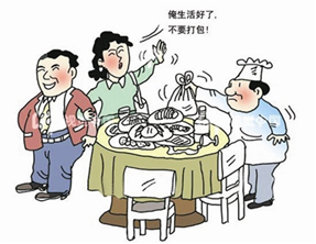 As is elaborately depicted by the drawing above, a couple has just finished their dinner, leaving lots of dishes on the table. But when the waiter packaged their dishes, the woman refused, saying "We are rich now, so we do not need to take away leftovers". This phenomenon can easily be found anywhere in our daily life.