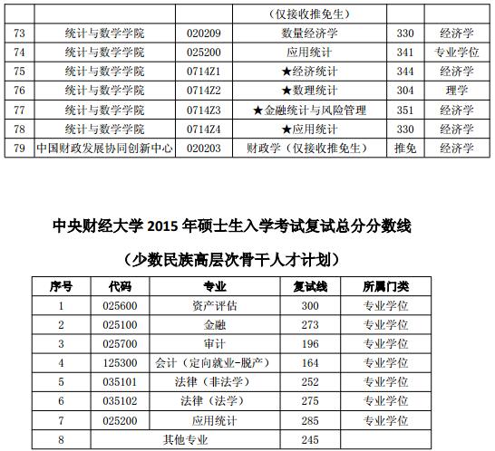 中央财经大学2015年硕士生入学考试复试总分分数线