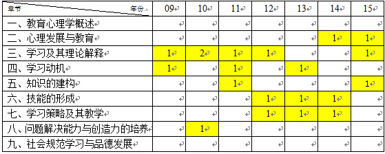 表1 09-15年教育心理学考研真题大题所在章节分布表: