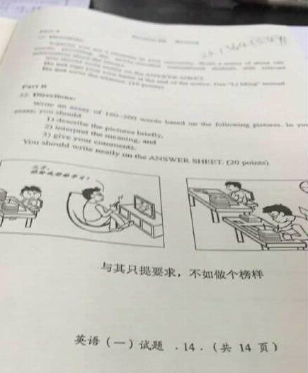 2016年考研英语(一)写作B节的命题呈现出两大规律:其一:命题形式稳定,依旧考察漫画作文,没有出现考生考前担心的图表作文;而且,图画作文一分为二,左右两幅,形成系列(a setof pictures),当然,这种漫画图片形式在2003年、2006年和2014年真题中已经出现;在加上图画下方的文字描述,也是一种常见的漫画命制方式。以上都体现了命题的稳定性和规律性;其二:反押题倾向愈发明显:2014年真题考察“相携”这样的“家庭与两代关系”话题之后,很多人认为,时隔2015年一年之后的2016年考研,应该不会再出现类似话题。然而,残酷的现实告诉我们,在考研考场上,一切皆有可能!考生在考前的复习备考中,可以根据话题的人们程度和可考频率按照重要顺序排序准备话题(比如“伦理道德类”排第一、“文化教育类”排第二),但是,盲目排除和抛弃某些“预计不会考的话题”是不科学的。全面而又层次地准备每种题型的话题,才是科学明智的备考方式!