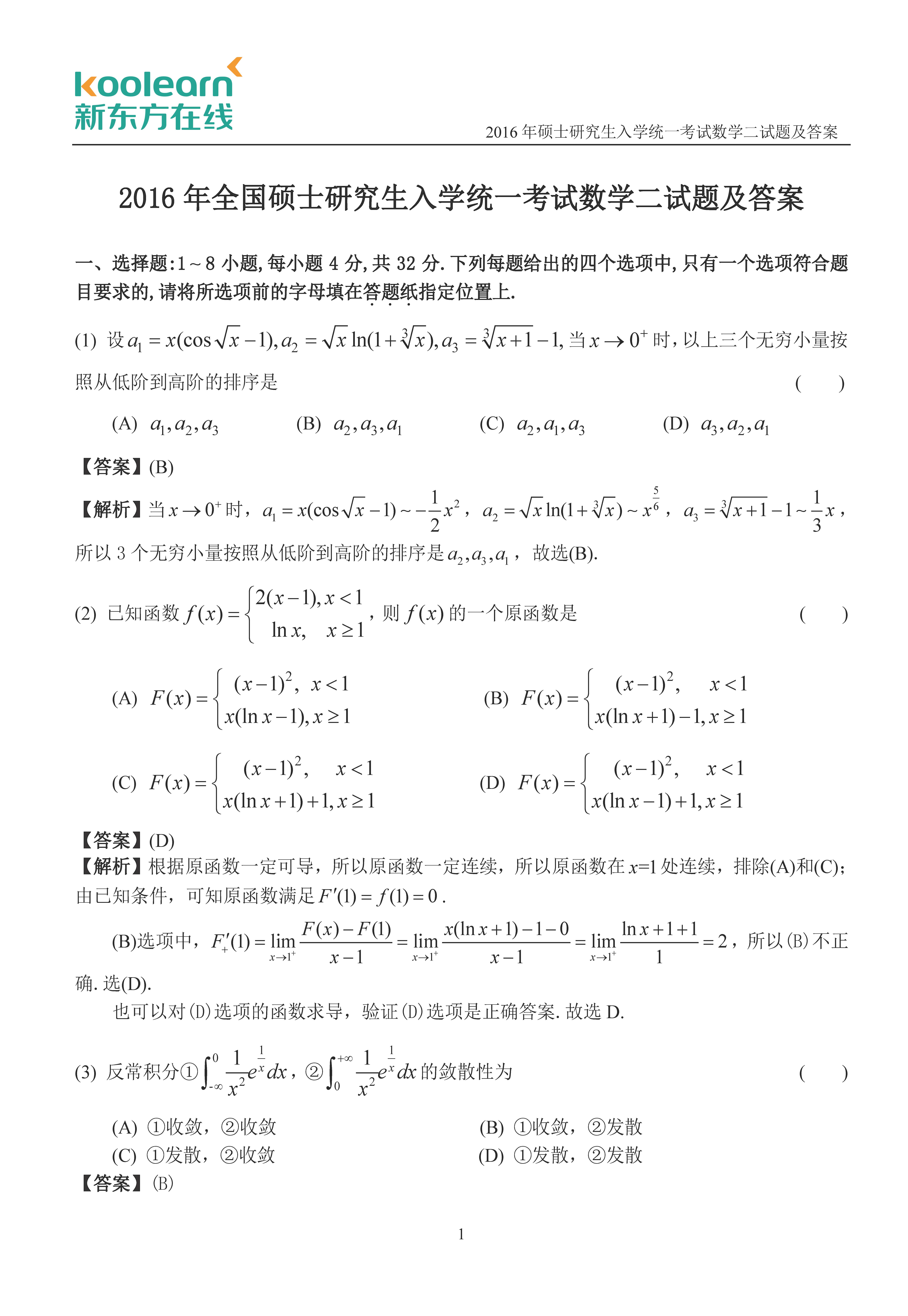 点击下载新东方2016考研数学二真题及答案解析(完整版)