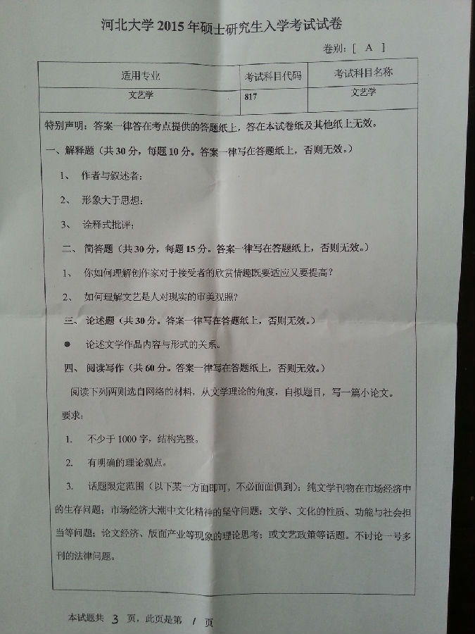 2015年河北大学817文艺学考研试题