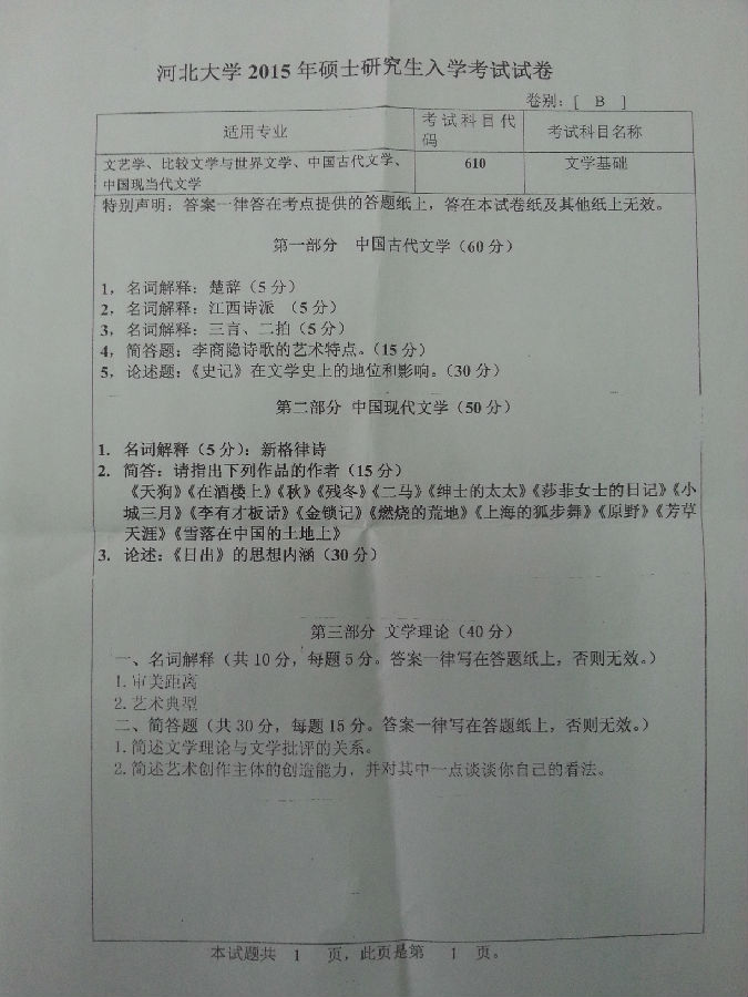2015年河北大学610文学基础考研试题