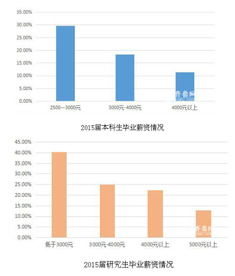 日前,山东大学等省部分部属高校公布了2015届毕业生就业质量报告。从已经公布的学校情况来看,我省非师范类毕业生的统计情况,本科生的薪资在2500—3000元之间的比例最高,研究生的情况也不是很乐观,超过四成的研究生薪资在3000元以下。
