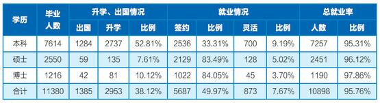 武汉大学近日公布了年2015年毕业生就业质量报告,该校2015年共11380名毕业生,其中本科毕业生7614人,硕士毕业生2550人,博士毕业生1216人。截至2015年12月30日,全校毕业生总就业落实率为95.76%,其中本科毕业生就业率95.31%,硕士毕业生就业率96.12%,博士毕业生就业率97.86%。