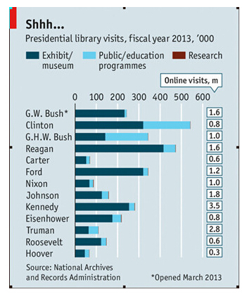 Last year a mere 10,600 scholars used the libraries. By contrast 730,000 people attendedpublic and educational programmes there, and 2.4m people visited the associated museums.Ronald Reagan's library in Simi, Californiawas the most visited in 2013, with some 425,000trooping in to see, among other things, his Air Force One. Online visits are more numerousand growing rapidly. Every library seems to be bigger than the last, but then records andartefacts are accumulating at an ever-faster clip. Herbert Hoover's library stores 500 gifts;Dwight Eisenhower's, 25,000; that of Bill Clinton (a man of appetites), more than 150,000.