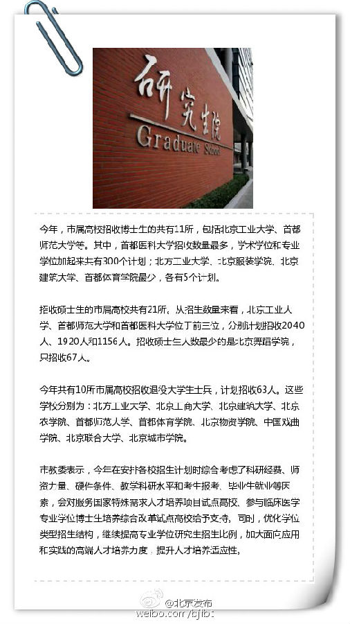 【市属高校今年多招673名研究生】今年北京市市属高校研究生招生计划12435人,比去年多673人.其中,博士生招生计划879人,比去年增加73人;硕士生招生计划11556人,比去年增加600人。新增硕士生招生计划原则上全部安排为专业学位类型。未经批准,任何单位和个人不得擅自变更招生计划。