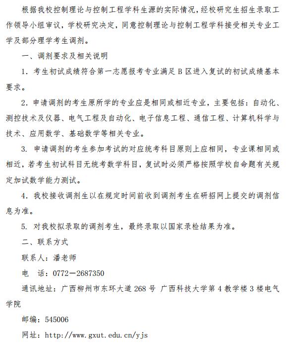广西科技大学控制理论与控制工程学科2016考研调剂信息