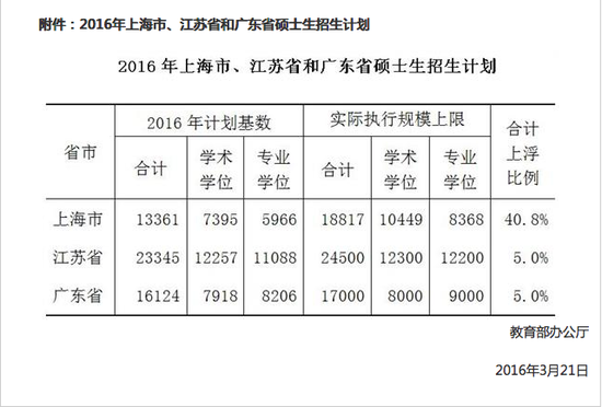 一、按照《教育部办公厅关于做好2016年研究生招生计划编制和管理工作的通知》(教发厅〔2016〕1 号)有关要求,同意上海市继续自主确定市属高校硕士生招生总规模和分校计划;同意江苏省、广东省在分省计划基础上,按不超过5%比例上浮确定所属高校硕士研究生招生计划,新增部分主要安排为专业学位类型。三省市招生计划上限见附件,政策支持的上浮部分计划不计入下年度各省(市)计划基数,仅限用于相关省市所属招生单位。