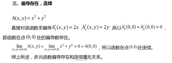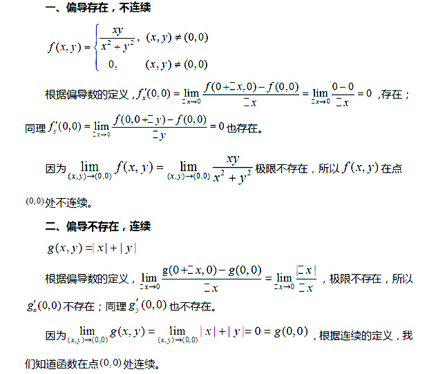 广大考研的同学在复习中往往忽略了一个问题,多元函数偏导存在和连续的关系与一元函数可导和连续的关系并不一样,一元函数中,函数在某一天可导,这个函数在该点一定连续;反过来,函数在某一点可导,这个函数在该点一定连续;反过来,函数在某点连续,但这个函数在该点不一定可导,典型的例子就睡y|x|。多远函数中,函数在某一点的偏导存在与这个函数在该点的连续性没有任何关系,我们给出三个函数例子,帮助考生更好地理解多元函数偏导存在和连续的关系。