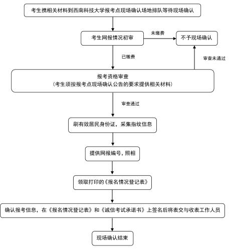 凡网上报名选择了西南科技大学报考点(5113)且已完成网上缴费程序的所有考生(推免生除外),应在规定的时间内进行现场确认。但在网上报名阶段重复选择四川省内报考点报名并交费的考生,如已按照四川省教育考试院公告要求在其官网上完成了选择5113报考点“保留考位”的,可参加本报考点的现场确认;如未按要求上网确认考位,请根据系统随机确认的考位到相应报考点进行现场确认。