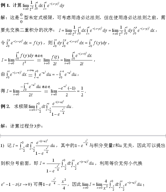 通过上面的分析和例题看到,在重积分中很多情况下都会用到变限积分函数的求导公式,例如求含二重积分的函数极限、偏导数的计算、重积分等式或不等式的证明等,计算或证明中常把重积分转化成或看作定积分来求导,必要时须交换积分次序,求极限时常结合洛必达法则和等价无穷小代换等方法,同学们在解答考研数学中类似问题时要灵活运用所学的各种知识。