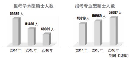 据统计,今年报考学术型硕士人数为49039人,比去年减少2421人,报考专业型硕士人数为58097人,比去年增加7108人。从2009年开始,教育部全面推行全日制专业学位硕士研究生招生考试,以适应考生和社会的需求,原传统的研究生培养模式改为学术型研究生,相比后者,前者更侧重于学生实践应用能力的培养。在去年,报考学术型硕士人数为51460人,比前年减少4529人,报考专业型硕士人数为50989人,比前年增加5170人。而在5年前,湖北报考专业硕士人数仅为22866人。业内人士分析,这种变化与专业型硕士不断扩招有关,也表明专业型硕士已经受到社会认可。