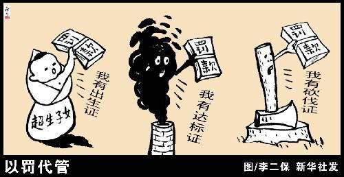 People have the illusion that they can do anything with money. Just as what is shown in the picture, by paying a penalty, people can give birth to more children, factories can let out the polluted air directly without any treatment, and trees can be felled at will.