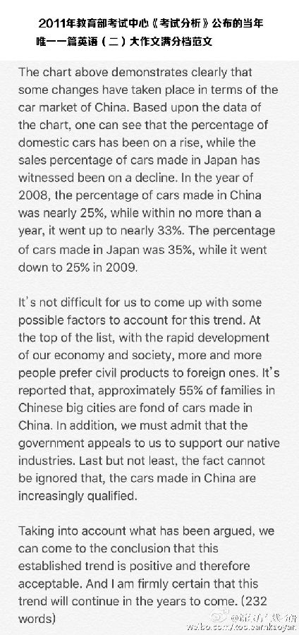 最后3天复习,英语还是要锁定作文,争取提分,模板范文素材多看看多背背。有时间练习几篇。尽管今年四六级作文反押题明显,但未必今年考研作文不考常见的创新等话题,大家还是要充分准备。下面是教育部《考试分析》中公布的2011年英语二大作文满分档范文,大家来体会下满分作文,争取给自己作文增色加分。
