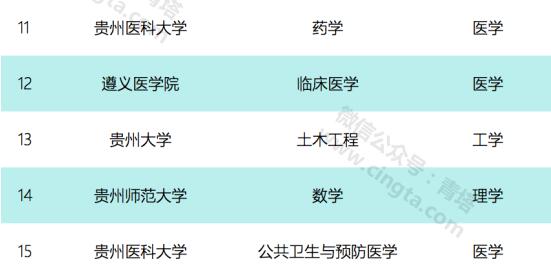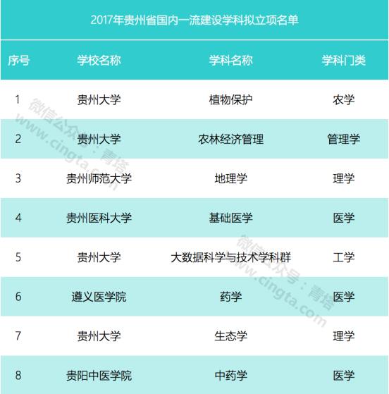 在贵州拟立项的8个国内一流建设学科中,贵州大学有4个,分别为植物保护、农林经济管理、大数据科学与技术学科群、生态学;贵州师范大学有1个,为地理学;遵义医学院有1个,为药学;贵阳中医学院有1个,为中药学。具体名单如下: