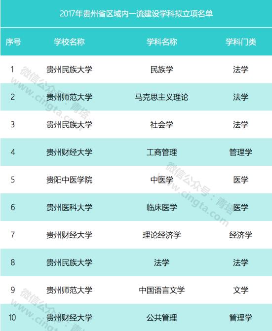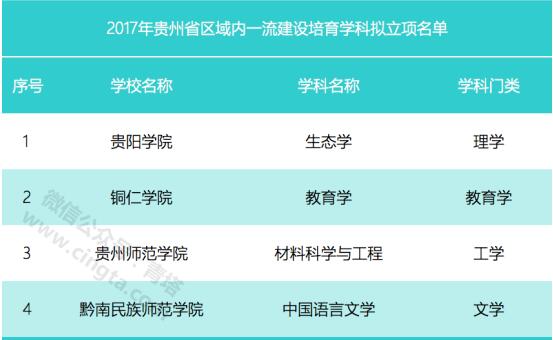 日前,贵州省教育厅对2017年一流学科拟立项名单进行公示,拟在全省11个高校中立项建设8个国内一流建设学科、15个区域一流建设学科、4个区域内一流建设培育学科,涵盖了贵州理工农医等多个学科门类。