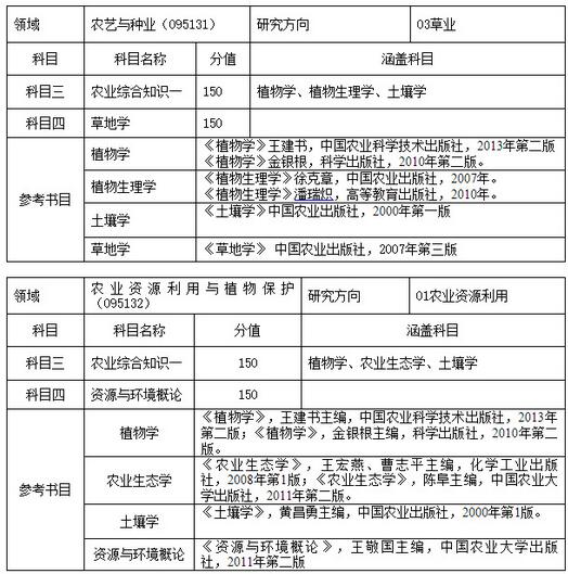 3.农业硕士各领域,初试科目三、科目四以及相关科目参考书目,见下表:
