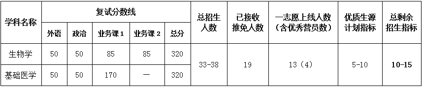 (一)我院按照生物学和基础医学两个一级学科进行招生,复试分数线及招生计划详见下表(如果国家线高于我院复试分数线,以国家线为准):