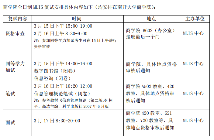 2019南开大学商学院全日制MLIS考研复试时间及地点