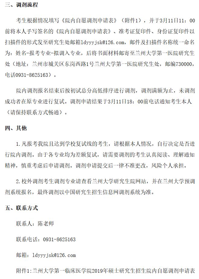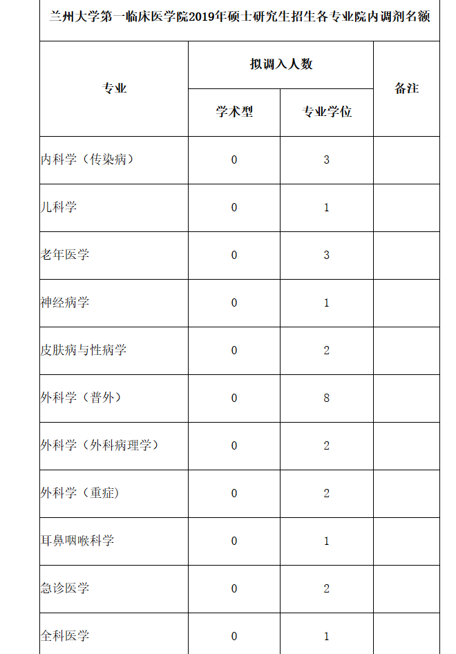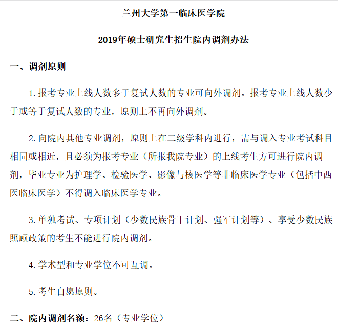 兰州大学2019第一临床医学院硕士招生院内调剂办法