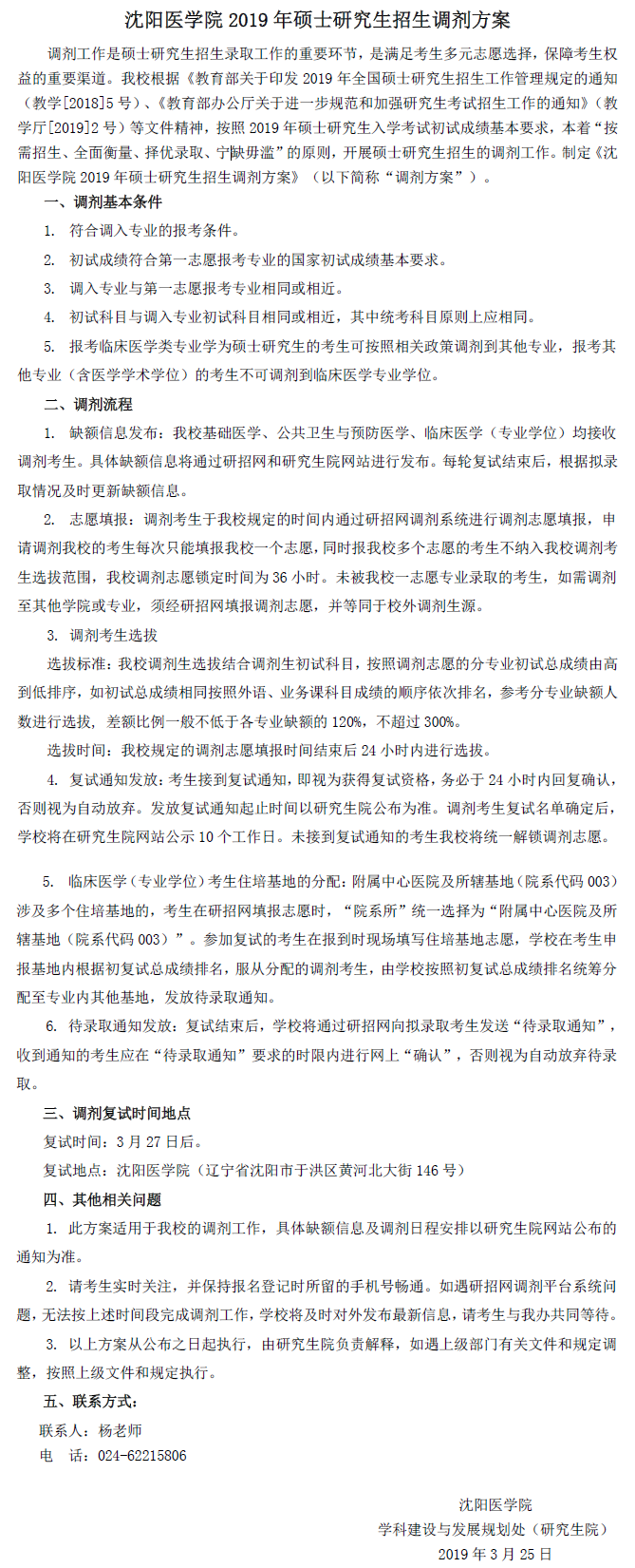 沈阳医学院2019年硕士研究生招生调剂方案内容如下