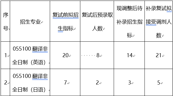 根据我院2019年翻译硕士(非全日制)招生复试情况,现公布英语翻译硕士(非全日制)和日语翻译硕士(非全日制)招生补录计划如下: