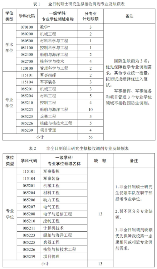 4月2日15:00,学校通过军训网“军队硕士研究生招生调剂服务系统”、互联网研招网“全国硕士生调剂服务系统”分别发布各学科军队在职干部、国防生缺额信息。