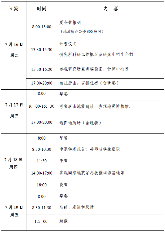 中国地震局地质研究所是一个包括地质、地球物理、地球化学和大地测量学的综合性、多学科的地球科学研究机构,是国内唯一一所以研究新构造运动和现今地球动力作用为主的国家级研究机构。为促进全国固体地球物理学、地质学等相关专业优秀本科生更好地了解中国地震局地质研究所,了解专业学术前沿动态,我所将选拔35-40名2020届地学专业本科生,开展优秀大学生暑期夏令营活动,为期4天(2019年7月16日至7月19日)。夏令营将展示地质所科研水平和学术氛围,推进优秀本科生熟悉研究所学科专业方向,与研究生导师零距离交流和沟通,激发学生学习热情和了解学术前沿动态。夏令营营员将获得中国地震局地质研究所“优秀大学生夏令营”活动结业证书。欢迎具有推荐免试资格和有志报考我所研究生的毕业生参加。