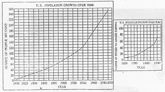 As is seen from the two graphs, it is clear that with the rapid growth of U.S. population from 1800 to 1990, the number of its wildlife species no longer existing soared during the same period. Naturally, we can draw the conclusion that the sharp decline of wildlife species resulted from the population growth.