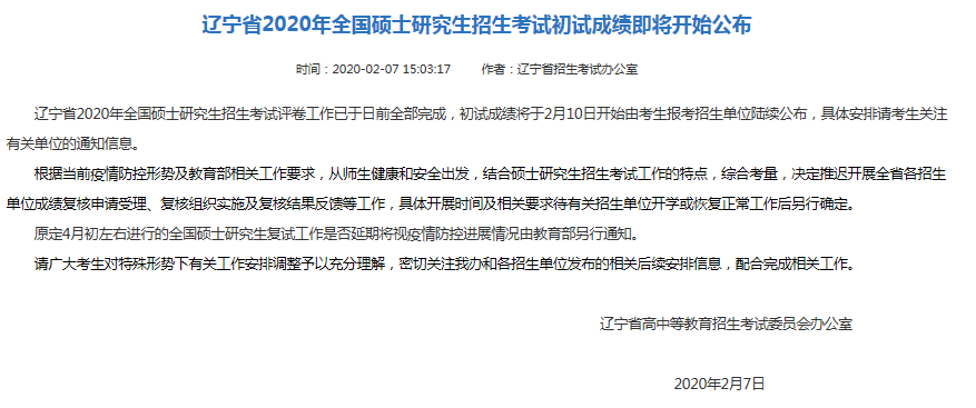 辽宁省2020年考研初试成绩即将于2月10日公布