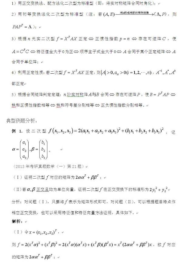 考研数学中,二次型是线性代数部分的重要考点之一,近些年是每年必考,并且常常是与特征值和特征向量结合在一起出一个大题,占11分,因此大家一定要理解其知识点,并熟练掌握其解题方法。关于二次型的考题,在数学(一)的考研试卷中偶尔也会结合高等数学中空间曲面方程的知识点进行,但对于数学(二)和数学(三)的考研试卷,则不会出现这种情况,这是因为数学(二)和数学(三)的考研大纲中不包括空间曲面的内容。下面对线性代数中二次型方面的典型考题作些分析总结,供各位考生参考,希望对大家有所帮助。
