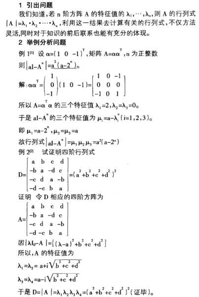 【小结】:本题用到了分块矩阵行列式的计算公式,也即拉普拉斯展开式。它在行列式计算中的作用与行列式的展开定理类似,都是将行列式降阶,进而降低计算难度。而通常情况下,它降阶的速度往往比展开定理更快。一般来说,当行列式中有较多的零时,就可以考虑利用行列式的性质将零集中起来,组成分块矩阵再进行计算。
