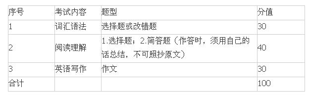 本考试内容包括以下部分:词汇语法、阅读理解、英语写作等。
