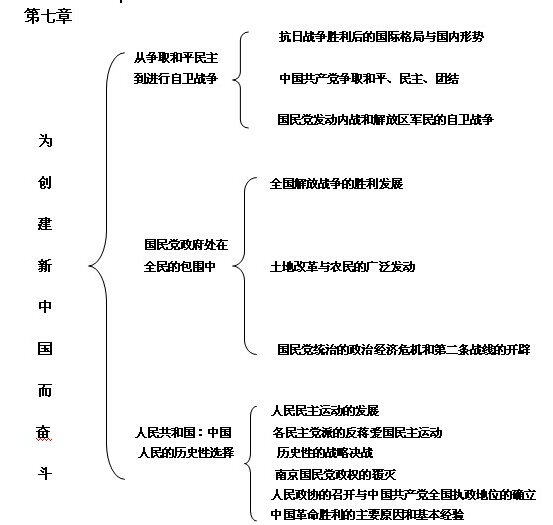 这一部分需要重点掌握的内容是:重庆谈判(双十协定),全面内战爆发,以革命战争反对反革命战争,以自卫战争粉碎国民党的军事进攻。