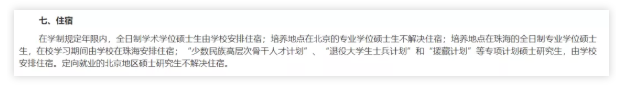 在学制规定年限内,全日制学术学位硕士生由学校安排住宿;培养地点在北京的专业学位硕士生不解决住宿;培养地点在珠海的全日制专业学位硕士生,在校学习期间由学校在珠海安排住宿;“少数民族高层次骨干人才计划”、“退役大学生士兵计划”和“援藏计划”等专项计划硕士研究生,由学校安排住宿。定向就业的北京地区硕士研究生不解决住宿。