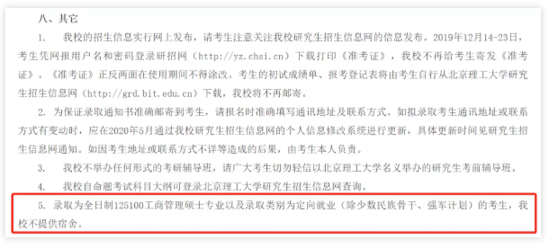 北京理工大学录取为全日制125100工商管理硕士专业以及录取类别为定向就业(除少数民族骨干、强军计划)的考生,我校不提供宿舍。
