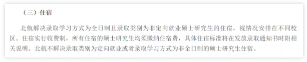 北航解决录取学习方式为全日制且录取类别为非定向就业硕士研究生的住宿,视情况安排在不同校区。住宿实行收费制,所有住宿的硕士研究生均须缴纳住宿费,具体住宿标准将在发放录取通知书时附相关说明。北航不解决录取类别为定向就业或者录取学习方式为非全日制的硕士研究生住宿。
