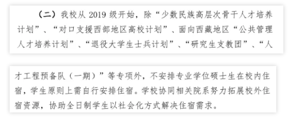 我校从2019级开始,除“少数民族高层次骨干人才培养计划”、“对口支援西部地区高校计划”、面向西藏地区“公共管理人才培养计划”、“退役大学生士兵计划”、“研究生支教团”、“人才工程预备队(一期)”等专项外,不安排专业学位硕士生在校内住宿,学生原则上需自行安排住宿。学校协同相关院系努力拓展校外住宿资源,协助全日制学生以社会化方式解决住宿需求。