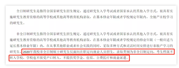 2020年我校非全日制硕士研究生仅面向在职定向就业人员招生,录取类别为非全日制定向,考生档案不转入学校,学校也不接受户口转入、不提供奖学金、住宿、公费医疗和就业派遣。