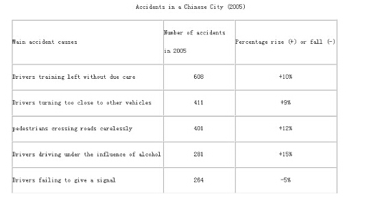 Here is a table, telling us an interesting phenomenon. There is no doubt that the table displays accidents in one Chinese city. As is clearly depicted, drivers turning left without due care cause the most accidents in this city and the percentage of drivers driving under the influence of alcohol enjoys the biggest rise in 2005. Obviously, the difference manifested by the table should be given more concern.