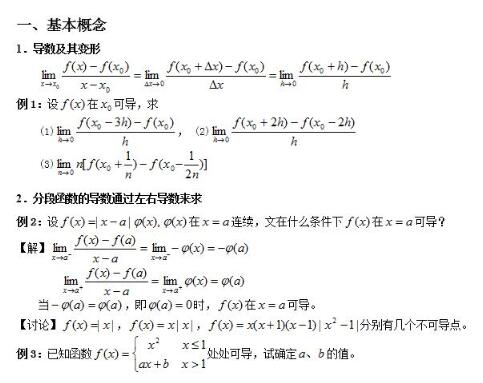 一元函数的导数与微分是微积分的基础,经常出选择题与填空题,可作为求极限、求驻点、求拐点、求多元函数的偏导数与全微分等问题的基础。重点掌握分段函数的导数、隐函数的导数、参数(极坐标)方程确定的函数的导数。变动上限的积分表示的函数的导数每年都考。