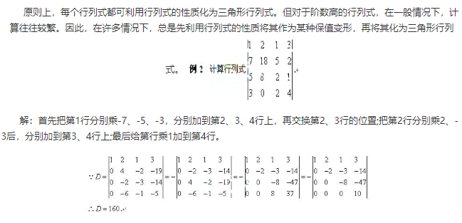 化三角形法是将原行列式化为上(下)三角形行列式或对角形行列式计算的一种方法。这是计算行列式的基本方法重要方法之一。因为利用行列式的定义容易求得上(下)三角形行列式或对角形行列式的性质将行列式化为三角形行列式计算。