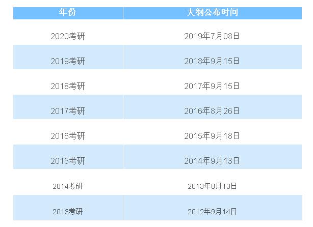 我们统计了近8年考研大纲的公布时间,都是在8月~9月份公布的,唯独去年大纲提早到7月份公布。